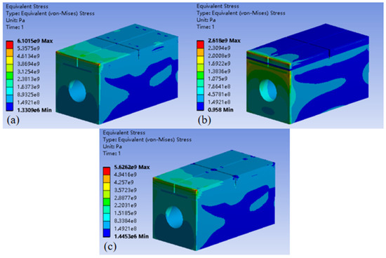 Stress distribution of different component distribution indices under a heat load of 10 MW/m2: (a) p = 0.6, (b) p = 1, (c) p = 1.4.