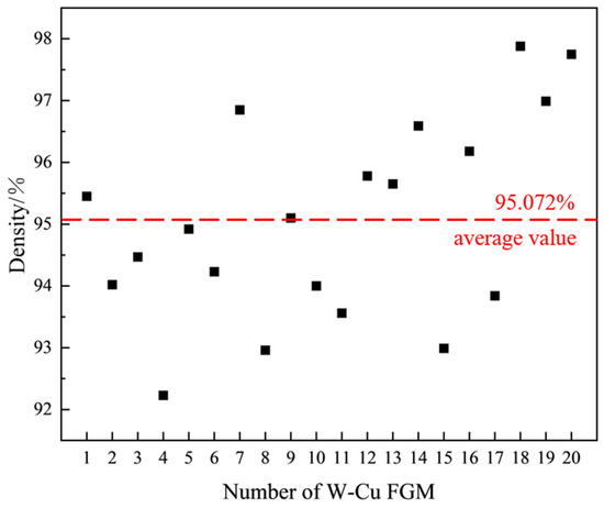 The densities of 20 specimens of W–Cu FGMs prepared by SLM were measured, and the results are shown in Figure 10, in which the highest densities are up to 98%, and the average densities are 95%. The W-20 vol% Cu layer does not have enough Cu matrix to connect the W zone due to too low a Cu content, resulting in more defects in this layer, which reduces the density of the W–Cu FGM.