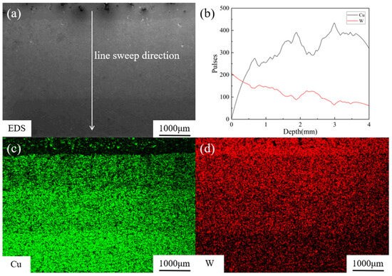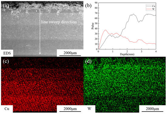 Figure 11 shows the energy-dispersive X-ray spectroscopy (EDS) results for the longitudinal section of W–Cu FGMs. As shown in Figure 11b, with increasing depth, the content of Cu gradually increases and the content of W gradually decreases. As can be seen in Figure 11c,d, the content of W and Cu in each gradient layer varies significantly, which indicates that the specimen possesses a gradient structure.