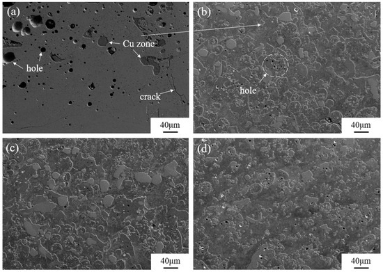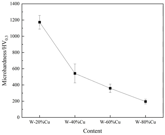 Figure 14 shows the Vickers hardness values of the specimens under a hardness load of 0.3 kgf with a loading time of 10 s. With the decrease in Cu content, the hardness decreases gradually. Especially when the Cu content increases from 20 vol% to 40 vol%, the hardness decreases most obviously.