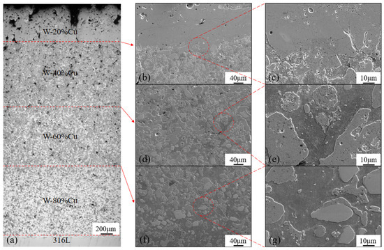 Figure 13 shows SEM images of the longitudinal section of the overall four-layered W–Cu FGMs. In Figure 13a, it can be observed that the W and Cu content changes with the increase in height and the thickness of the W-20 vol% Cu layer is thinner compared to the other layers. As can be seen in Figure 13b,d,f, a good graded composition transition is found, and the interfaces between layers are clear. According to Figure 13c,e,g, the W zone at the interface is well combined with the Cu zone, and the Cu zone completely covers the W zone without micropores and microcracks. The W-20 vol% Cu layer does not have enough Cu matrix to encapsulate and connect to the W zone due to insufficient copper content, resulting in spalling of the layer, leading to a lower thickness. The W–Cu FGM is kept at a higher temperature during the SLM, so that the infiltration of Cu into W is improved, leading to the improvement of the forming quality of the tungsten–copper gradient material. Therefore, the tungsten–copper gradient material has a better forming quality.