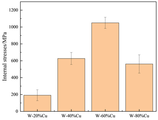 Figure 15 shows the internal stresses in the gradient layer of W–Cu FGMs. Compressive stresses within the W–Cu FGMs were as follows. The internal stresses of W-20 vol% Cu, W-40 vol% Cu, W-60 vol% Cu, and W-80 vol% Cu were 191.7 MPa, 627 MPa, 1049.5 MPa, and 561.9 MPa, respectively. The internal stress of W-20 vol% Cu is much lower than that of the other three compositions, and the internal stress of W-80 vol% Cu is lower than that of W-40 vol% Cu and W-60 vol% Cu. W-20 vol% Cu has more internal holes, cracks, and other defects, which is conducive to the release of accumulated interior stresses during SLM, resulting in lower internal stresses. W-80 vol% Cu has a high copper content, which is remelted during SLM to release internal stresses.