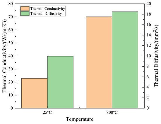 Figure 16 shows the thermal conductivity and thermal diffusivity of W–Cu FGM at 25 °C and 800 °C. The thermal conductivity of W–Cu FGM is 23 W/m·K and the thermal diffusivity is 10 mm2/s at 25 °C, and the thermal conductivity increased to 70 W/m·K and the thermal diffusion coefficient increased to 18.5 mm2/s at 800 °C. The thermal conductivity of W–Cu FGM is lower than that of W.