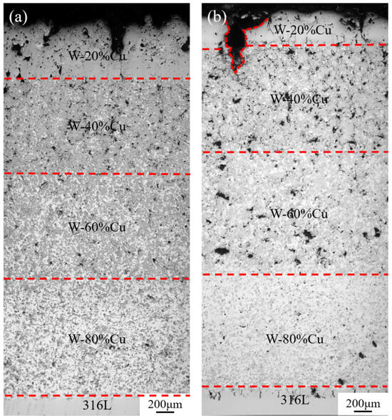 Figure 18b shows the longitudinal section morphology of W–Cu FGM after thermal shock testing. Comparing Figure 18a,b, it can be found that the defects of W–Cu FGM after the thermal shock test increased significantly and the densities decreased by 10%. As the Cu content decreases, the more defects increase in the corresponding region after the thermal shock test: W-80 vol% Cu has the least increase in defects; for W-60 vol% Cu, W-40 vol% Cu the defects gradually increase, and its defects are mainly holes; W-20 vol% Cu is located in the surface layer of the W–Cu FGM, resulting in severe oxidation, which reduces its thickness to 0.6 mm, and oxidized flaking in some areas resulting in partial exposure of W-40 vol% Cu.
