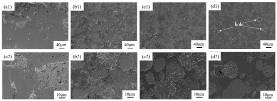 SEM images of W–Cu FGM after the thermal shock test: (a1,a2) W-20 vol% Cu, (b1,b2) W-40 vol% Cu, (c1,c2) W-60 vol% Cu, (d1,d2) W-80 vol% Cu.