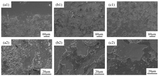 SEM images of W–Cu FGM after the thermal shock test: (a1,a2) W-20 vol% Cu/W-40 vol% Cu interface, (b1,b2) W-40 vol% Cu/W-60 vol% Cu interface, (c1,c2) W-60 vol% Cu/W-80 vol% Cu interface.