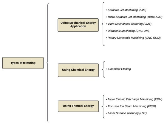 Surface texturing on cutting tools can be performed through different technologies. Each of them creates geometrical characteristics (shapes, dimensions, and the density and form of surface distributions) [12,32,33]. Figure 1 summarizes the technologies, clasified by the type of energy used during the texturing process. According to the literature, the most widely used technique for texturing cutting tools is Laser Surface Texturing (LST).