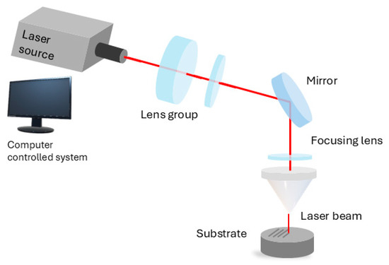 During ablation, the material is removed through laser-energy absorption, where high-energy pulses rapidly melt and vaporize the material. To achieve the ablation phenomenon, the ablation threshold of the material must be exceeded. For a higher ablation rate, higher energy intensities are required. Thus, two phenomena appear: soft ablation (Coulomb explosion), where energy intensities are close to the ablation threshold, and strong ablation (thermal vaporization), where energy intensities significantly exceed the threshold. Soft ablation results in smoother surfaces with limited depth per pulse, while strong ablation provides a higher material removal rate but leaves a rougher surface [38,39,40]. Figure 2 shows the scheme configuration of LST by direct ablation.