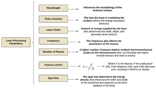 In LST processes, the characterization of the textures generated on substrates can be effectively monitored by adjusting the laser parameters. The texturing process is significantly influenced by several parameters, including wavelength, pulse duration, laser power, pulse rate, number of passes, fluence (J/cm2) and spot size, among others [35,39]. The main LST processing parameters in the development of textures are illustrated in Figure 4.
