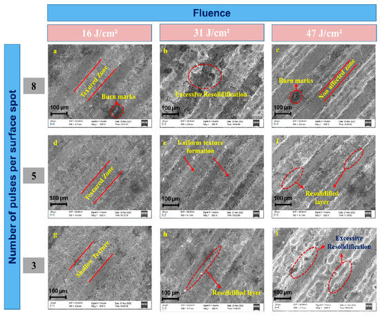 Laser texturing of tungsten carbide substrate: (a) 16 J/cm2, 8 pulses; (b) 31 J/cm2, 8 pulses; (c) 47 J/cm2, 5 pulses; (d) 16 J/cm2, 5 pulses; (e) 31 J/cm2, 5 pulses; (f) 47 J/cm2, 5 pulses; (g) 16 J/cm2, 3 pulses; (h) 31 J/cm2, 3 pulses; and (i) 47 J/cm2, 3 pulses. Adapted from Ref. [79].