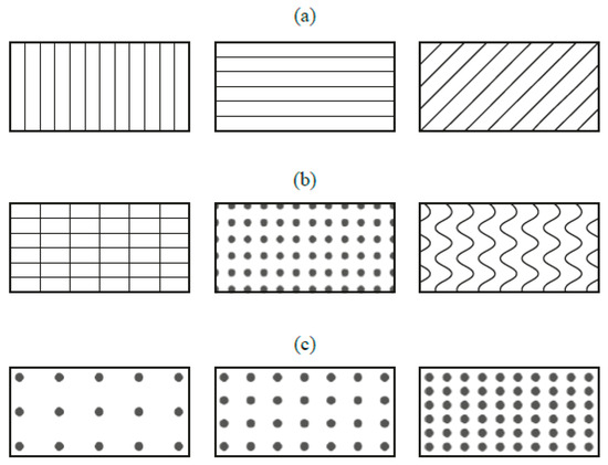 - LST by direct ablation: Short, high-intensity laser pulses are used to remove material from a surface in a controlled manner. This ablation process evaporates or sublimates tiny surface areas, allowing for custom-designed textures that can enhance properties such as friction reduction, wear resistance and hydrophobicity [31,35].