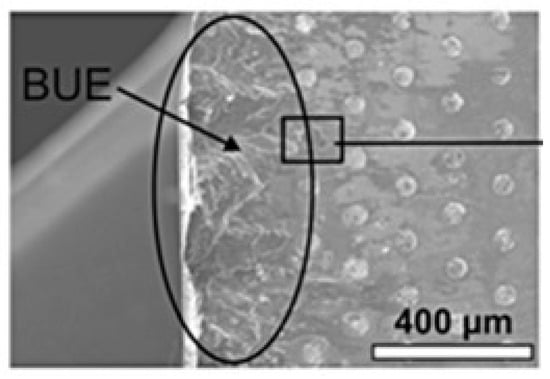 Built-up edge (BUE) generated on a textured tool rake face. Adapted from Ref. [39].