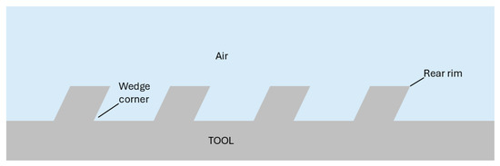 In a review, Özel et al. [52] mentioned this point. In this case, it was determined that grooves on the rake faces of cutting tools are most effective when aligned parallel to the cutting edge rather than in the direction of chip flow. This alignment plays a crucial role in managing chip movement and mitigating tool wear. Additionally, there is strong evidence suggesting that grooves oriented perpendicularly to the cutting edge on the flank face can enhance the delivery of cutting fluid to the tool–workpiece contact zone, improving lubrication and cooling efficiency.
