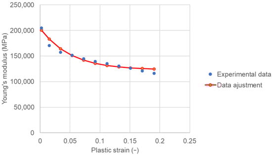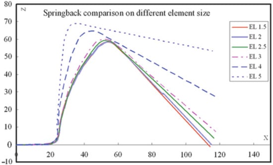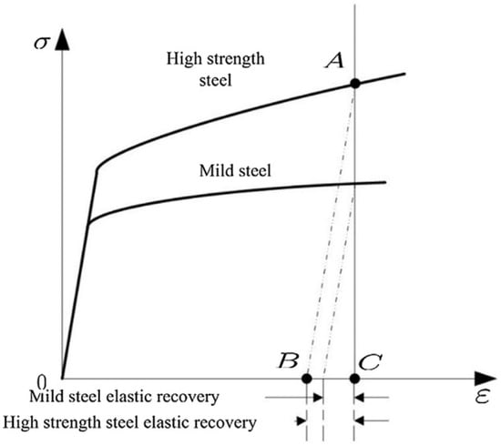 In the case of a tensile test, when the material is unloaded after a plastic strain (line AC of Figure 3), the stress–strain curve returns to zero with an inclined line with the same angle as the elastic strain line, which corresponds to the material’s Young’s modulus. Normally, materials that are of the same nature, for example, alloys of steel, aluminum, or titanium, have almost the same modulus of elasticity, regardless of the yield stress being lower or higher. Consequently, if the steel has greater mechanical resistance, it will necessarily present a higher springback, which corresponds to the BC line in Figure 3.