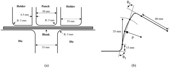 (a) Standard geometry used for the study of springback; (b) measurements made on the part after bending []. Reproduced with permission from Elsevier, 2024.