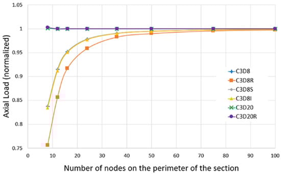 Convergence analysis on the axial loading value (normalized) as a function of the density and the element type. Figure reproduced under Creative Commons Attribution 4.0 International License from [].