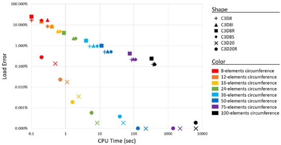 The error in the axial loading estimation as a function of the CPU time, for different element types and numbers of elements. Figure reproduced under Creative Commons Attribution 4.0 International License from [].