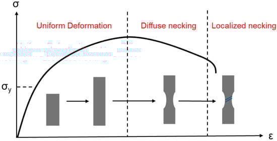 In a uniaxial tensile test, it is possible to know the basic behavior of a material regarding the formation of the defect by ductile fracture. Figure 10 shows three types of deformation that occur in a uniaxial tensile test on a sheet. At the beginning of the plastic strain until the peak of the material’s strength, the strain is uniform, that is, distributed throughout the region that has the same geometry. At this point, the metal has practically the same strain in any region of the specimen of the same geometry. After ultimate tensile strength, the curve begins to fall slightly as a phenomenon of necking called “diffuse necking” begins to occur where the material has a decrease in width, which is in the central region of the specimen and differs from the rest. From that moment on, the rest of the material does not deform plastically, serving as an anchor for the deformations, that is, there will only be movement of material in the region of the strain. With the advance of the test displacement, a third type of deformation called “localized necking” appears [], which occurs in the thickness of the material. At that moment, as the portion of the metal that is under movement is very small (practically only in thickness), failure or rupture is imminent and soon the fracture occurs. At this stage, the rest of the material, similarly to diffuse necking, will serve as an anchor and will no longer deform and therefore the failure is quickly reached. The localized necking is usually inclined in relation to the application of force in the test, reaching close to 55° of angulation. This is because this angle would have the highest shear stress, and this has already been proven mathematically.