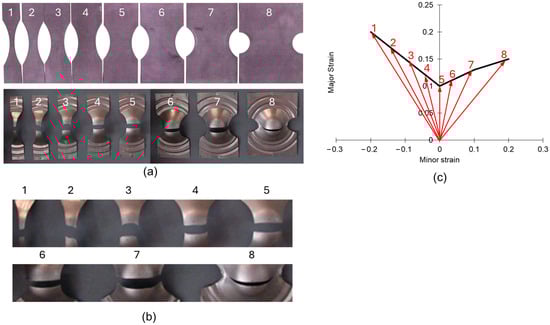 Forming Limit Diagram obtained by measuring the diffuse necking: (a) specimens, (b) fracture regions, and (c) plotted curve.