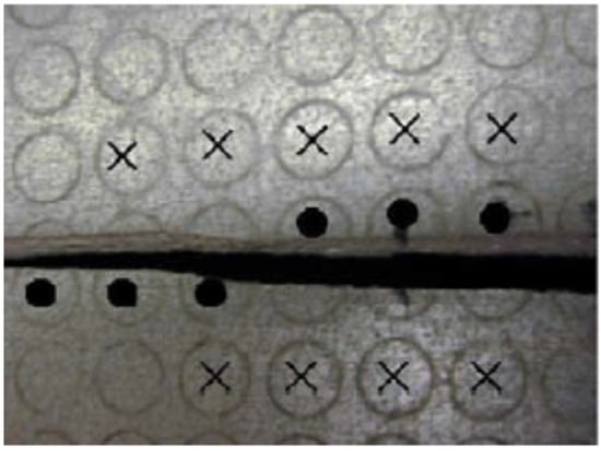The curve in Figure 15 is recommended for materials that exhibit diffuse necking behavior before fracture, because how it is obtained depends on a measurement that cannot get close enough to the failure. Figure 16 shows how strains are measured in the Nakajima test. As one can see, the measurable circles are those that have not been fractured (marked with an X) and that are relatively far from the fractured circles (marked with a dot), which are not entirely measured. This measurement methodology results in small errors, since it is not possible to measure the deformations in the failure region, and the FLD curve is produced from measurements of regions close to the fracture. Figure 17a shows an ideal measurement that would be in the zone of localized necking and Figure 17b shows where strains are generally measured in a Nakajima test.