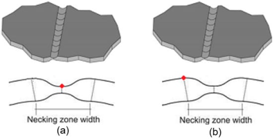 Location of positions where deformations can be measured. (a) In the necking zone. (b) Out of the necking zone. Figure reproduced under Creative Commons Attribution 4.0 International License from [].