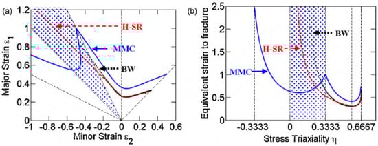 Figure 18a shows three curves where the black and red curves are FLD curves obtained through calculations that are based on the hardening exponent and the blue curve is the FFLD curve developed through the Modified Mohr–Coulomb (MMC) theory. This theory defines a fracture criterion which considers that the fracture occurs when a combination of normal stresses and shear stress reaches a certain value [,,]. The MMC curve is first obtained to plot the equivalent strain until fracture versus triaxial strain graph (Figure 18b). Triaxial stress is defined as the ratio of the mean stress (the three main stresses divided by 3) by the equivalent stress (von Mises stress). From the triaxial curve, the FLD is obtained. Thus, the FFLD curve can be added to software that simulates stamping processes and serves as a failure criterion, that is, any strain that goes beyond this curve will fracture.