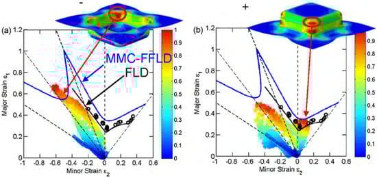 Global strain status, experimental FLC, and damage: (a) results at the integration points located on the negative surface; (b) results at the integration points located on the positive surface []. Reproduced with permission from Elsevier, 2024.
