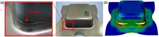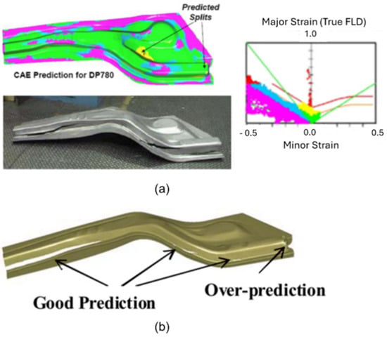 Comparison between results obtained in a (a) simulation using the FLC curve and (b) a simulation using the MMC fracture criterion of an automotive front rail made from DP780 steel []. Reproduced with permission from SAE international, 2024.