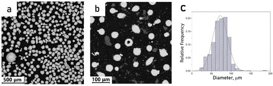 Powder characteristics, studied by SEM, are shown in Figure 1. The diameter and number of spherical particles were quantified using at least five SEM images. Powder particles were characterised by a predominantly spherical morphology with some satellites on the surface (Figure 1a). Some particles contained spherical pores, but their fraction was less than 4% (Figure 1b). The particle size distribution in Figure 1c shows that particles are mostly 25–110 µm in size, with 1% of all particles being coarser (up to 230 µm). The average size of particles is 75 µm.