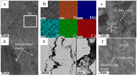 Hot cracking was observed in the René 80-type alloy in the present study, namely solidification cracking (Figure 3e), which is usually found in Ni-based superalloys obtained both by conventional and additive manufacturing [22,36]. In additively manufactured or welded metals, the complex heat history including repeated thermal cycles, rapid heating, and cooling rates, leads to the formation of dendritic structure. Molten metal at the melt pools solidifies under non-equilibrium conditions causing the segregation of elements. As dendrites grow, the islands of remaining liquid are formed in the interdendritic regions. With further solidification, liquid films formed in these areas under the influence of high residual stresses resulting from the shrinkage lead to the formation of cracks [44]. It is worth noting that element segregation was observed in both walls, but solidification cracking did not develop in the smaller wall. The second type of cracks observed in the alloy is associated with the ductility-dip cracking in the solid-state condition. In this work, it was found that the σ-phase could cause the initiation of DDC in René 80 alloy (Figure 5b). Microcracks, formed on the second phase particles, further propagate at high-angle grain boundaries (Figure 3f). Similar behaviour has been reported for Laves phase particles in the Thermo-Span superalloy [45]. DDCs usually propagate at long grain boundaries, since their gliding and migration at elevated temperatures are facilitated [46,47]. Although the fraction of grain boundaries decorated with σ-phase particles was higher in the crack-free wall (Figure 3a,d), it is obvious that the columnar structure, with long straight boundaries, provided more possibilities for fast crack propagation [48]. Meanwhile, equiaxed crystals are expected to have better crack resistance because tortuous boundaries effectively retard the propagation of cracks [49,50]. Additionally, EBSD analysis confirmed that cracks propagate mostly along the high-angle grain boundaries (misorientation angles more than 15°) (insert in Figure 4b), which is consistent with previous studies [24,51].