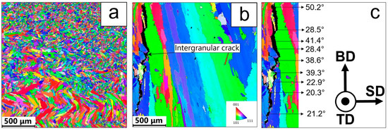 EBSD IPF images of (a) crack-free and (b) cracked walls in the longitudinal section; (c) the local misorientation between the grains near the crack. Here, BD—building direction, SD—scanning direction, TD—transverse direction.