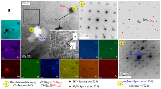 Detailed TEM studies of the alloy microstructure are presented in Figure 5. The fine structure of the crack-free wall (Figure 5a) consisted of the γ matrix and γ′ precipitates. The volume fraction of γ′ phase was relatively high (~55%), whereas the size of precipitates was very small—26 nm. Irregular (Cr, Co, Mo)-rich particles and (Ti, C)-rich particles were also found in the structure. Selected area electron diffraction (SAED) patterns allowed the identification of the (Cr, Co, Mo)-rich and (Ti, C)-rich particles as σ-phase and MC-types (TiC) carbides, respectively. In addition, the precipitation of (Al, O)-rich particles, which were deciphered as the Al2O oxides, occurred adjacent to carbides. Carbide and oxide precipitates adopted a “cube-on-cube” orientation relationship. The cracked wall had a qualitatively similar fine structure, but we observed the microcracks that initiated within σ-phase particles (Figure 5b).