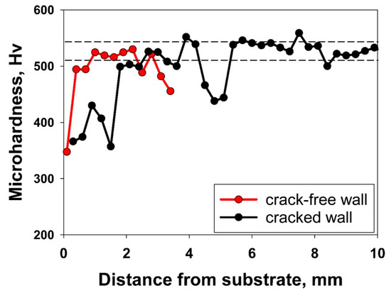 Figure 6 presents microhardness profiles from the bottom to the top of the walls. Both profiles showed a similar trend: a rapid increase in hardness from ~350–370 HV with elevating distance from the substrate, reaching an approximately constant value of ~510–540 HV (indicated by dotted lines). Slightly lower hardness in the cracked wall should be noted. Further, a gradual decrease in hardness in the top of the crack-free wall was most likely associated with the development of porosity. In turn, sudden drops in the hardness of the cracked wall were caused by the presence of microcracks in the indentation area.