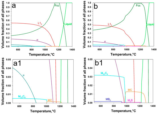 Equilibrium phase diagram of (a) the René 80-type and (b) the “standard” (AMS-5403) René 80 superalloys; (a1,b1) corresponding enlarged areas with a phase fraction of up to 0.05.