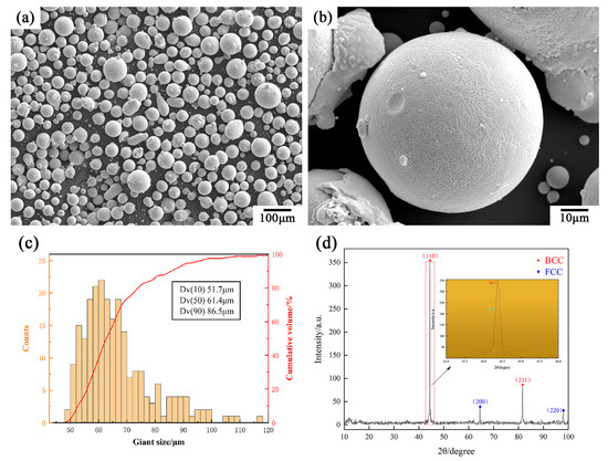 High-entropy alloy powder: (a) microstructural morphology; (b) enlarged view; (c) particle size distribution of the powder; (d) XRD pattern.