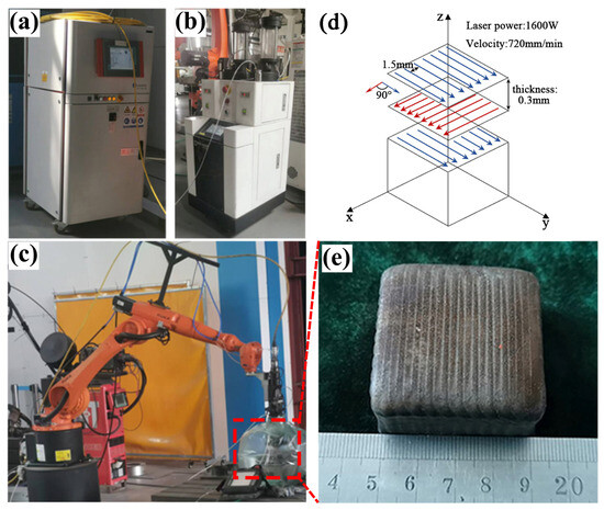 A KUKA KR60L30 (KUKA Robot GmbH, Augsburg, Bavaria, Germany) laser was utilized to fabricate an HEA bulk sample measuring 40 mm × 40 mm × 20 mm on a GH4169 substrate (Shenyang Zhongke Yucheng Technology Co., Ltd., Shenyang, China) via the LMD technique, under the following conditions: a laser power of 1600 W, a scanning speed of 720 mm/min, a layer thickness of 0.3 mm, a spot diameter of 3.5 mm, and a scanning distance of 3 mm. During the preparation process, the substrate was first preheated to 200 °C, with argon gas continuously supplied at a flow rate of 0.45 L/min to maintain an inert gas atmosphere. Upon completion of the fabrication process, the sample was subjected to air cooling. Figure 2 illustrates a schematic of the LMD printing process. The samples underwent HIP treatment as outlined in Table 1, followed by cooling in a furnace. As depicted in Figure 2d, the schematic diagram of the LMD process is provided. For each printed layer, the scanning direction is rotated by 90°, and a cooling period of 3 min is applied between layers. The post-printing specimen, shown in Figure 2e, exhibits no defects such as unmelted regions, pores, or cracks, thereby indicating a high-quality formation.