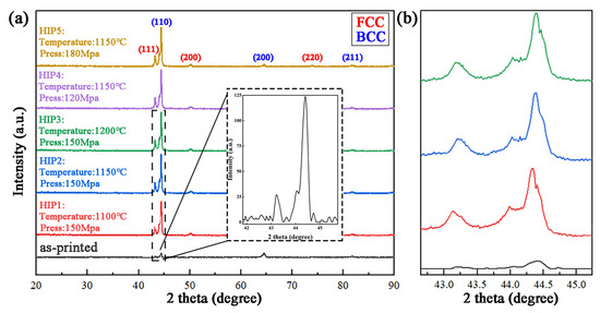 The XRD patterns of the specimens produced by LMD and HIP are presented in Figure 3. The crystal structure of the as-printed specimens exhibits a dual-phase structure composed of FCC and BCC phases, with the BCC phase further classified into BCC1 and B2 phases, consistent with prior research findings [26,27,28,29,30]. The diffraction peaks for the as-printed specimens primarily appear at 44.4° and 64.4°, with an additional (200)fcc diffraction peak observed at 50.1° in comparison to the HEA powder. In contrast to the as-printed specimens, the diffraction peaks for the HIPed specimens demonstrate a tendency to shift to lower angles, with a pronounced peak at 44.4°, indicating an enhanced degree of grain orientation along the (110)bcc direction. Figure 3b presents an enlarged view of the XRD pattern, indicating that, as the HIP temperature increases, the diffraction peaks gradually shift to the right. This shift is attributed to the recrystallization of the HEA samples resulting from increased thermal input, leading to lattice distortion under elevated temperature and pressure, consequently resulting in a decrease in the lattice constant. Conversely, varying the HIP pressure has a negligible effect on the phase composition.
