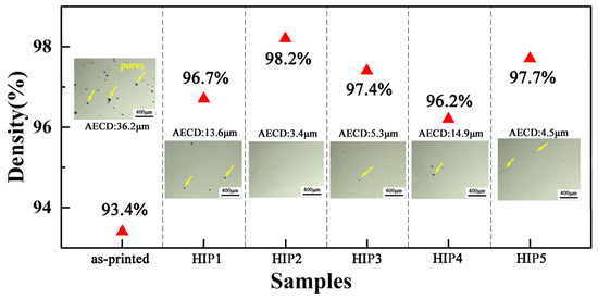 During the HIP process, the printed specimen is subjected to uniform triaxial pressure at elevated temperatures, which facilitates the closure of pores under compression. When the temperature reaches 1150 °C and the pressure reaches 150 MPa, the specimen achieves the highest density, reaching 98.2%. Simultaneously, the average equivalent circle diameter (AECD) of the pores decreases from 36.2 μm to 3.4 μm. As the temperature continues to rise to 1200 °C, the sample density slightly decreases, likely due to the onset of tissue stress from excessive temperature, which impedes further pore closure. The pore analysis results of the low-pressure sample (HIP4) indicate that pressure plays a significant role in enhancing the sample density. Appropriate pressure promotes the compression of pores, microcracks, and other voids within the material. When the pressure is increased to 180 MPa (HIP5), the pores are effectively eliminated by the greater equiaxed pressure, resulting in an increase in density to 97.7%. However, it is important to note that this conclusion is based on metallographic images and calculations performed using Image-J software. Compared to methods such as industrial CT scanning, this approach has certain limitations.