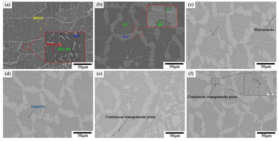 Figure 5c–f displays the microstructures of HIP1, HIP3, HIP4, and HIP5 specimens, respectively. A comparison with Figure 5b indicates that the microstructural morphology of HIPed specimens is similar under various HIP parameters. For HIP1, due to the relatively low heat treatment temperature, microcracks were not fully closed. In contrast, HIP3 reveals the presence of impurities within the microstructure due to the higher thermal input. Figure 5e,f demonstrates that pressure variations resulted in continuous transgranular pores within the microstructure, with these defects appearing exclusively inside the B2 phase.