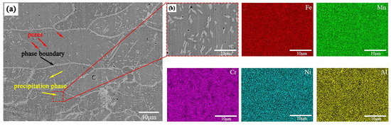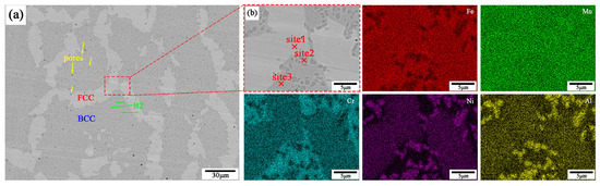 To assess the influence of HIP on the elemental distribution in HEAs, surface scans by EDS were conducted on both the as-printed and HIP2 specimens, as illustrated in Figure 6 and Figure 7. During the LMD process, rapid cooling induced the preferential formation of the BCC phase, which demonstrates superior stability at elevated temperatures due to its comparatively lower free energy. HIP treatment facilitated the growth of the FCC phase, resulting in a marked expansion of the FCC phase. Furthermore, the increased temperature during HIP treatment facilitated the precipitation of an Al- and Ni-rich B2 phase (ordered BCC) resulting from elemental diffusion within the BCC matrix. Notably, the Mn distribution remained relatively uniform in both the as-printed and HIPed specimens, which aligns with prior studies [39,40,41,42].