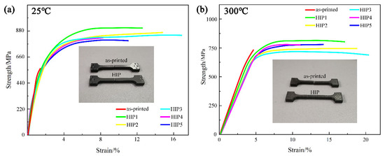 - At room temperature, as-printed samples experienced premature fracture due to stress concentration caused by internal microcracks. In comparison to as-printed samples, the HIPed samples exhibited higher σUTS and εf, with σUTS reaching 903.9 MPa and εf reaching 17.4%. The tensile samples at 300 °C exhibit a similar trend, with the σUTS of HIPed samples reaching 800.7 MPa and the εf reaching 20.5%. An increase in HIP temperature results in a decrease in σUTS and an increase in εf, whereas an increase in pressure leads to a reduction in both σUTS and εf.