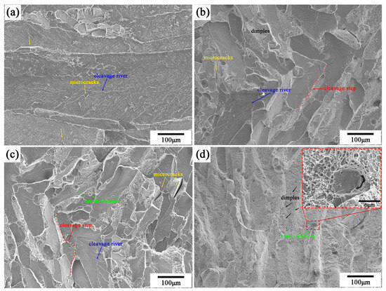 Figure 9c,d displays the tensile fracture morphology of the aforementioned high-entropy alloys following LMD and HIP treatment at 300 °C. A comparison indicates that the fracture morphology of the as-printed high-entropy alloy exhibits cleavage river patterns, cleavage steps, and features a small number of dimples, with brittle fracture being dominant. The fracture mechanism is characterized by both cleavage and tough fractures; however, microcracks are clearly observed at the fracture interface. The stress concentration caused by these microcracks is the primary reason for the premature fracture of the as-printed specimens, and the fracture morphology of the HIPed specimens resembles that of the as-printed specimens. The high-temperature fracture morphology of the HIPed specimen differs significantly from that of the as-printed specimen. A large number of dimples are observed on the fracture surface, with their size being finer than that observed at room temperature. A small number of brittle fractures are also present, with an enlarged view of these brittle fractures displayed in the upper right of Figure 9d. It is evident that hot isostatic pressing mitigates microcracks within the material, alleviates internal stress concentration, enhances the density of high-entropy alloys, and improves fracture toughness.
