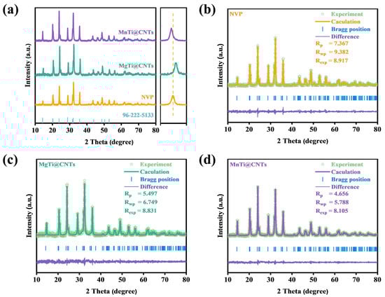 (a) XRD patterns of NVP, MgTi@CNTs, and MnTi@CNTs samples; refined XRD patterns of (b) NVP, (c) MgTi@CNTs, (d) MnTi@CNTs samples.