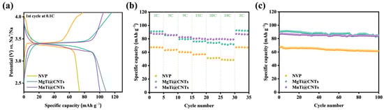 (a) First GCD curves of NVP, MgTi@CNTs, and MnTi@CNTs at 0.1 C. (b) Rate performance curves of NVP, MgTi@CNTs, and MnTi@CNTs at 2–24 C. (c) Cycling curves of NVP, MgTi@CNTs, and MnTi@CNTs at 2 C.
