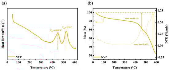 In order to analyze the thermal stability of the electrode material in a fully charged state, DSC and TG tests were performed on the charged electrode at a specific temperature (Figure 3, Figure 4 and Figure 5). As shown in Figure 3a, NVP has an exothermic peak at 448 °C and 523 °C, respectively, and exothermic enthalpy of 525.30 J/g and 523.70 J/g, respectively (Table 2). The mass loss of NVP at 20–600 °C was further analyzed in Figure 3b. According to the weight loss derivative (DTG) curve, the thermogravimetric curve can be divided into two parts, corresponding to the DSC curve. The first part of the mass loss occurred at 20–450 °C, with a loss of 18.3%, which was due to the decomposition of the binder PVDF in the electrode. At 580 °C, a total of 40.65% significant weight loss occurred, which was the result of the surface reaction of the cathode–electrolyte interface (CEI) components and the change in the crystal structure of NVP [37,38].