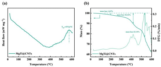 (a) DSC curves of MgTi@CNTs electrodes, (b) TG/DTG curves of MgTi@CNTs electrodes.