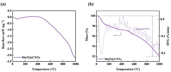 The MnTi@CNTs electrode doped with p-n-type heterogeneous ions showed different heat flow trends compared with the other two. As shown in Figure 5a, no obvious endothermic/exothermic reaction was observed at 20–1000 °C. This indicates that the MnTi@CNTs electrode is thermodynamically stable in the temperature range of 0–1000 °C, which is due to the effective enhancement of the electronic conductivity and ion diffusivity of NVP by Mn/Ti co-doping, expanding the gap space of the NVP structure and making the crystal structure more stable. The mass loss of MnTi@CNTs was further tested (Figure 5b). At 1000 °C, a total of 7.9% mass loss occurred, indicating the micro-decomposition of PVDF binder in MnTi@CNTs electrode. The MnTi@CNTs electrode material exhibits excellent thermal stability at 20–1000 °C.