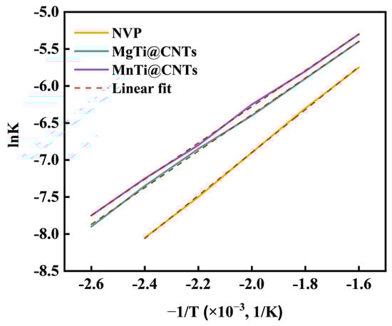 According to the kinetic calculation theory, the activation energy (E) of the self-heating process of the battery was obtained from the fitting results of lnK and -1/T. E is an important parameter to measure the difficulty of the reaction, which represents the minimum energy required for the reaction. The larger the E value, the more difficult it is for the reaction to occur. Figure 7 shows the fitting results of lnK and -1/T after different electrode ARC tests. The calculated results are shown in Table 3. The E value of NVP is 2.41 × 104 J/mol. The higher E value of the NVP electrode system means that more energy is required for the system’s reactants to overcome the reaction barrier. This typically results in the reaction being difficult to occur and having a slower reaction rate, i.e., the system has a higher self-heating temperature and a lower self-heating rate, consistent with the results in Figure 6. Even at higher temperatures, the reaction does not immediately occur, which improves the system’s stability in high-temperature environments, thereby enhancing the thermal safety of the system. In contrast, the optimized NVP electrode system has a reduced E value, which allows the system’s exothermic reaction to occur at a lower temperature with a higher reaction rate, exhibiting a stronger system reactivity. This shows that NVP has higher safety in the presence of electrolytes. Although the MgTi@CNTs and MnTi@CNTs batteries have the same initial self-exothermic temperature, the heating rate and E value of the MnTi@CNTs battery after heat release indicate its lower thermal safety.