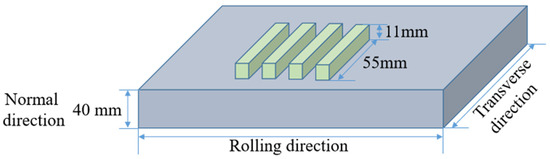The thickness of the base metal is 40 mm, and the thermal simulation sample is taken horizontally along the plate from the middle of the thickness of the plate. The length direction of the sample is perpendicular to the rolling direction of the steel plate. The size of the thermal simulation sample is 11 mm × 11 mm × 55 mm. The schematic of the sample orientation is illustrated in Figure 1. The thermal cycle parameter is shown in Table 2.