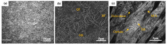 The microstructure of the base metal is shown in Figure 3. The base metal structure consists of granular bainite (GB), quasi-polygonal ferrite (QF), bainite ferrite (BF) and fine granular carbides and is a typical tempered sorbite structure. The width of the bainite lath is about 0.5~1 μm, and the lath contains high-density dislocations inside. The laths are separated by low-angle grain boundaries. The M/A components are distributed in thin film form at the boundary of the bainite laths. Due to high-temperature tempering, some dislocations recovered, the uniform dislocation density decreased, the entangled dislocation formed cellular structures, the low-angle grain boundaries between the laths moved or disappeared, the boundary between the adjacent laths gradually blurred, and the M/A between the laths changed from thin film to block or granular.